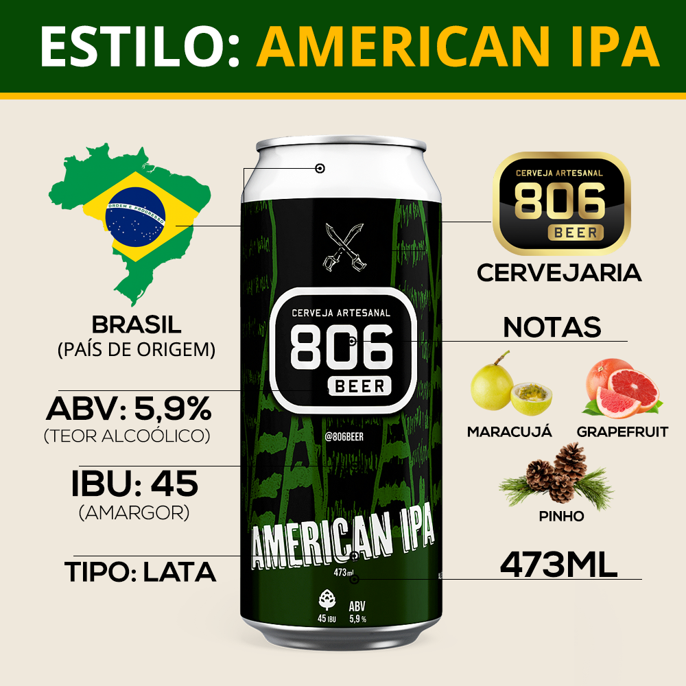 cerveja 806 beer american ipa, ipa 806, cerveja artesanal ipa, cerveja premium lata 473ml, ipa brasileira, cerveja lupulada, cerveja para churrasco, comprar american ipa online