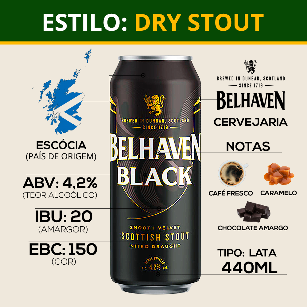 A Belhaven Black Scottish Stout é uma cerveja escura e aveludada, produzida na Escócia desde 1719 pela tradicional cervejaria Belhaven Brewery. Com o sistema Nitro Draught, oferece uma experiência cremosa no paladar, com colarinho consistente e corpo suave.
