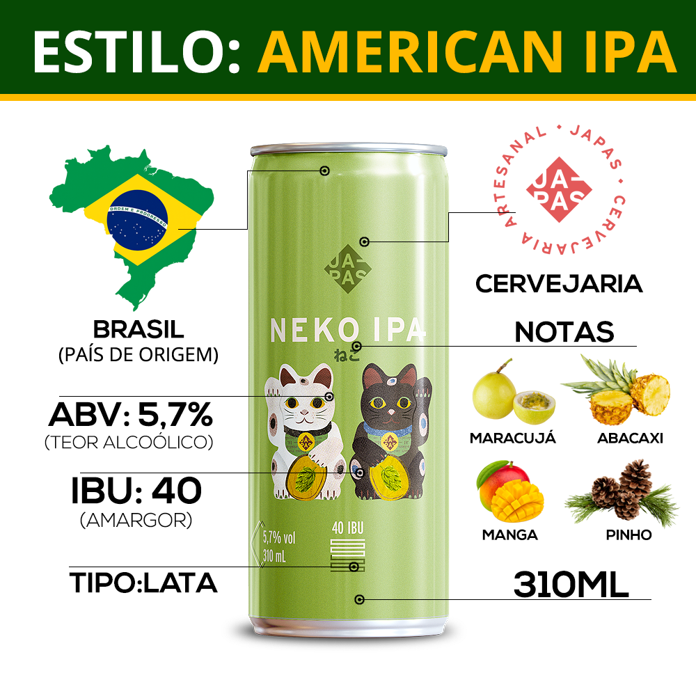 A Neko IPA é uma cerveja artesanal produzida pela inovadora Japas Cervejaria, trazendo o melhor do estilo American IPA com toques cítricos e frutados marcantes. Com ilustrações dos icônicos gatos da sorte japoneses, o rótulo já dá o tom da experiência cultural e sensorial que essa cerveja oferece.