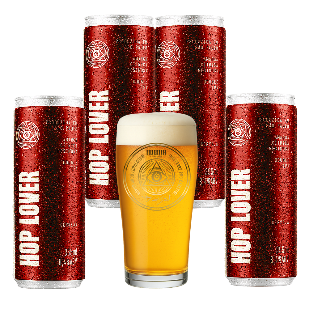 Mais quantidade da cerveja artesanal Dogma Hop Lover (Double IPA, 355 ml) para garantir frescor de lúpulo em várias ocasiões, com o Copo Willy 320 ml incluso.